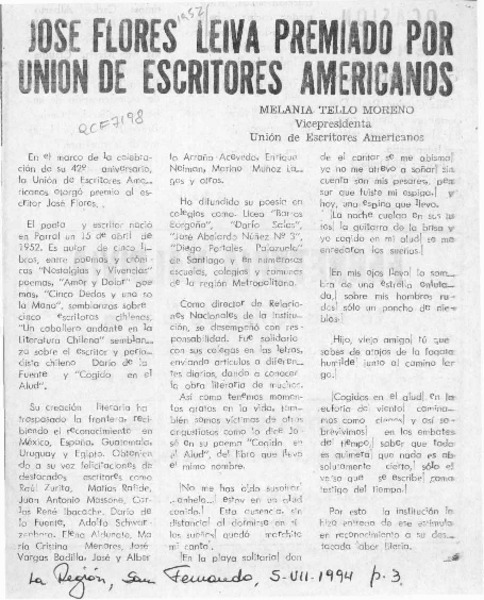 José Flores Leiva premiado por Unión de Escritores Americanos [artículo] Melania Tello Moreno.