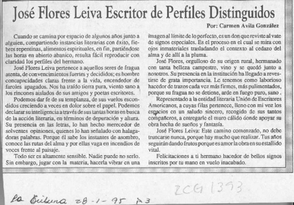 José Flores Leiva escritor de perfiles distinguidos [artículo] Carmen Avila González.
