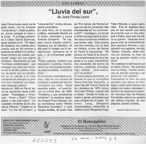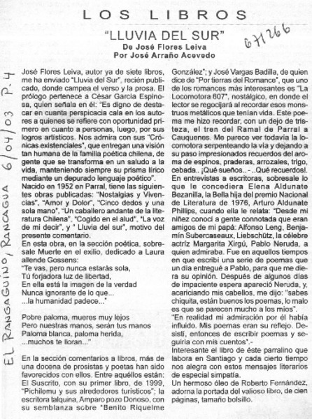 Lluvia del sur" [artículo] José Arraño Acevedo.
