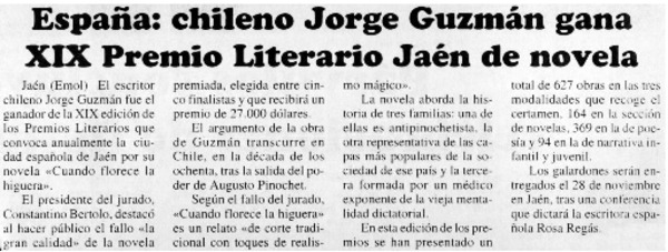 España: chileno Jorge Guzmán gana XIX Premio Literario Jaén de novela. [artículo]