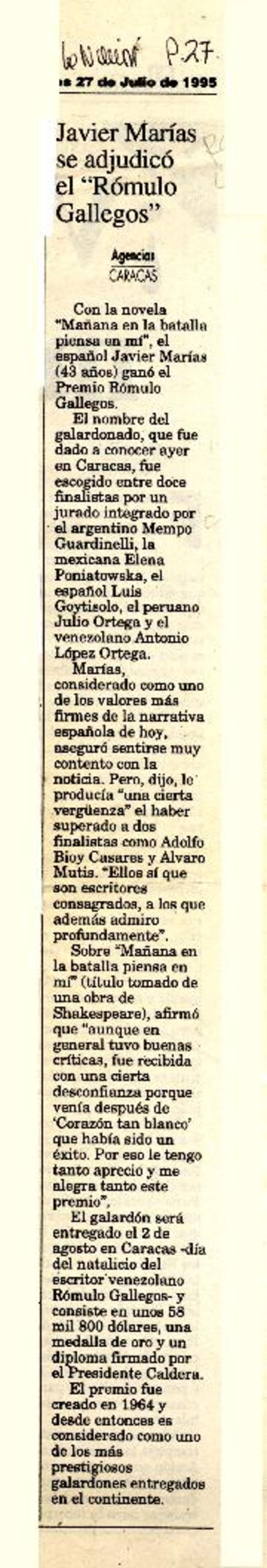 Javier Marías se adjudicó el "Rómulo Gallegos" [artículo].