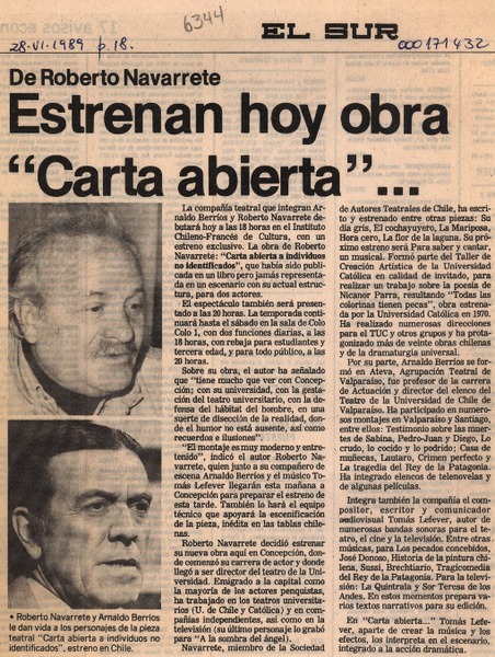 Estrenan hoy obra "Carta abierta" -- [artículo].