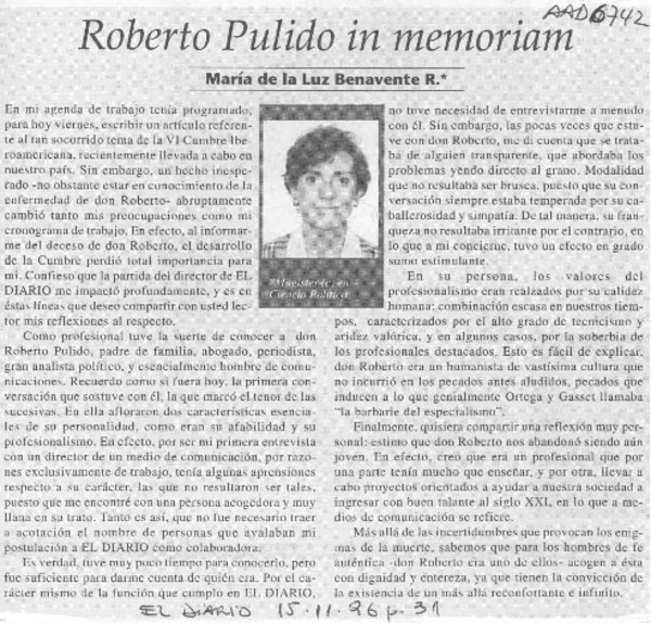 Roberto Pulido in memoriam [artículo] María de la Luz Benavente R.