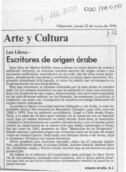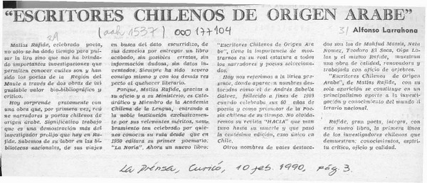 "Escritores chilenos de origen árabe" [artículo] Alfonso Larrahona.