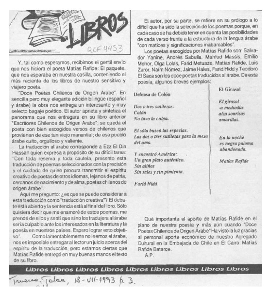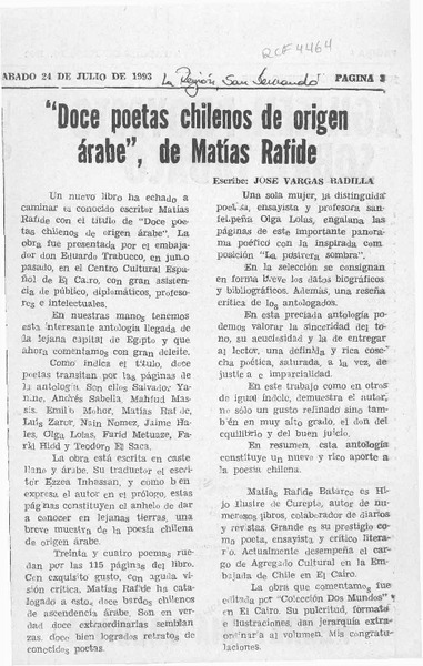 "Doce poetas chilenos de origen árabe", de Matías Rafide [artículo] José Vargas Badilla.