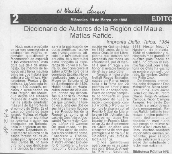 RAFIDE, MATIAS - DICCIONARIO DE AUTORES DE LA REGION DEL MAULE