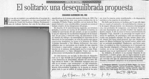 El solitario, una desequilibrada propuesta [artículo] Eduardo Guerrero del Río.