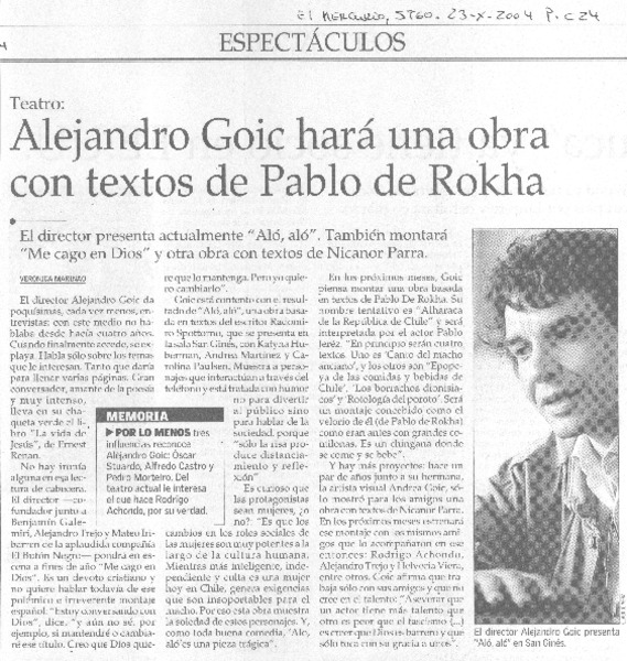 Alejandro Goic hará una obra con textos de Pablo de Rokha [artículo] Verónica Marinao