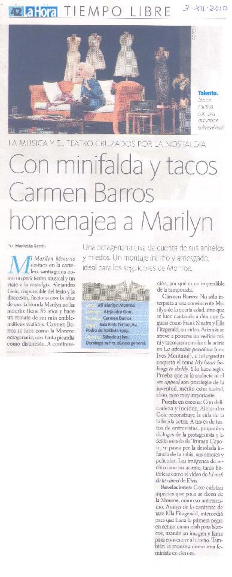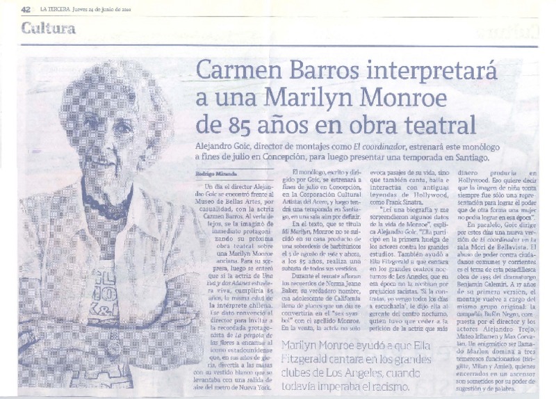 Carmen Barros interpretará a una Marilyn Monroe de 85 años en obra teatral [artículo] Rodrigo Miranda.