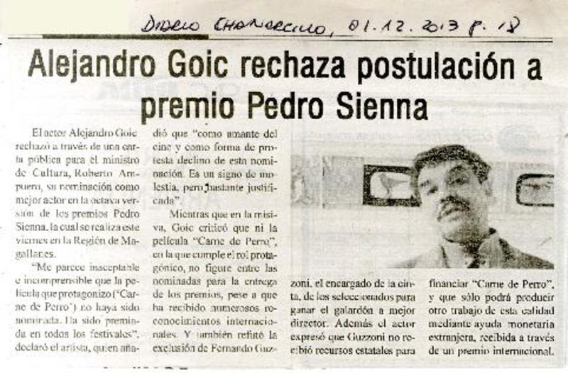 Alejandro Goic rechaza postulación a premio Pedro Sienna. [artículo]