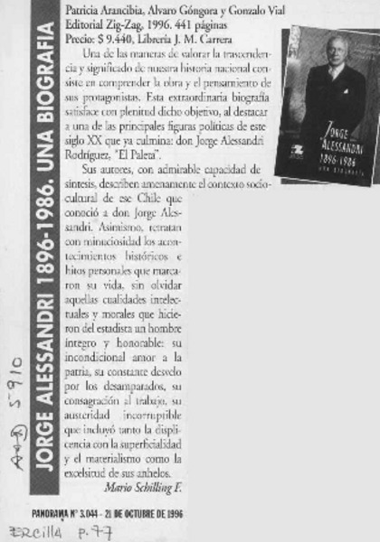 Jorge Alessandri 1896-1986, una biografía [artículo] Mario Schilling F.