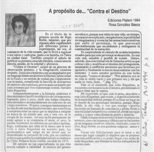 A propósito de -- "Contra el destino" [artículo] Rosa González Baeza.