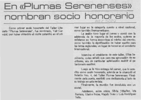 En "Plumas serenenses" nombran socio honorario [artículo].