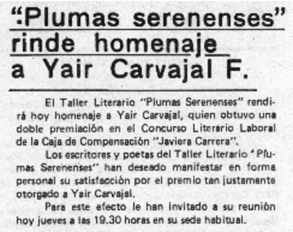 "Pluma serenenses" rinde homenaje a Yair Carvajal F. [artículo]