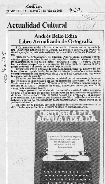Andrés Bello edita libro actualizado de ortografía [artículo].