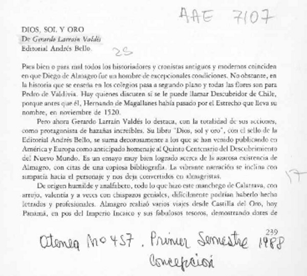 Neruda, Pablo - Calderón, Alfonso - Larraín Valdés, Gerardo - Poesía - Guerrero Yoacham, Cristian - Garrido Rojas, José - Historia de la reforma agraria en Chile - Valdés, María Soledad - Vallejo Vera, Miguel Arturo - O'Higgins una visión desconocida - Dios, sol y oro - Una invisible comparsa