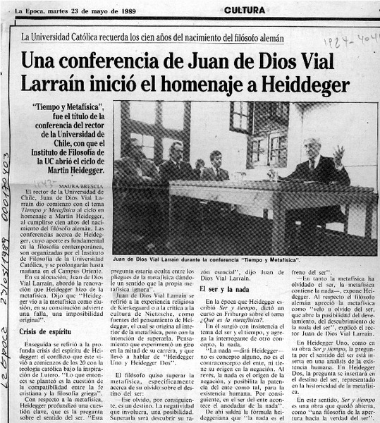 Una conferencia de Juan de Dios Vial Larraín inició el homenaje a Heiddeger [artículo] Maura Brescia.