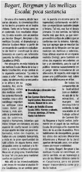Bogart, Bergman y las mellizas Escala : poca sustancia [artículo] Eduardo Guerrero del Río.