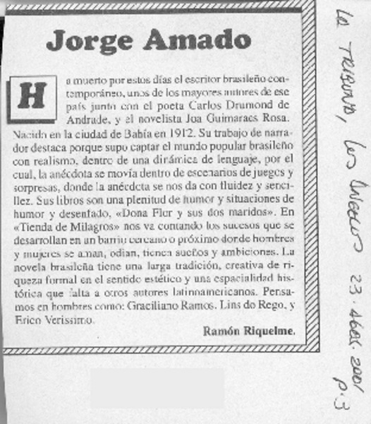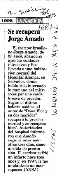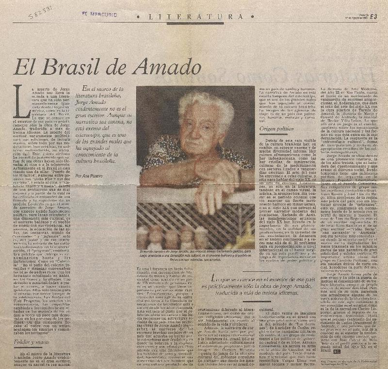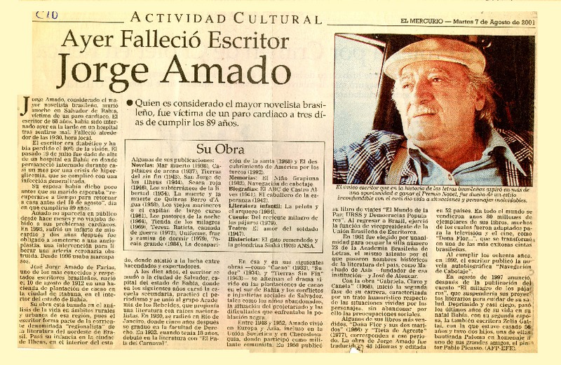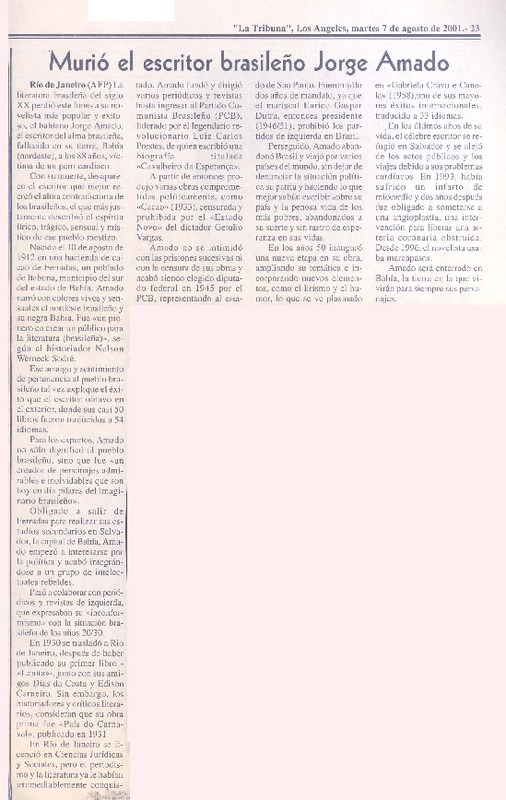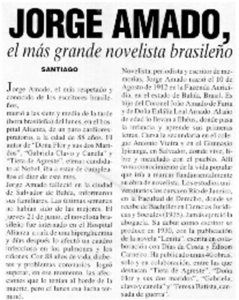 Murió Jorge Amado, el más grande novelista brasileño Producto de un paro cardiorespiratorio dejó de existir a los 88 años [artículo] : S.F. y J.C.R.