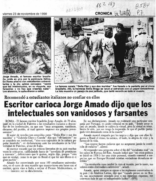 Escritor carioca Jorge Amado dijo que los intelectuales son vanidosos y farsantes [artículo].