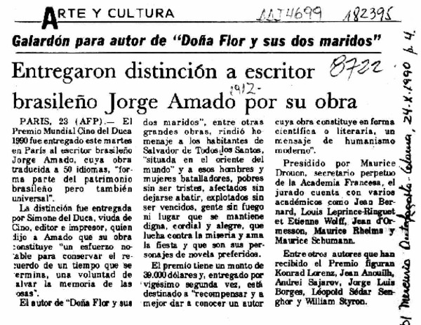 Entregaron distinción a escritor brasileño Jorge Amado por su obra [artículo].