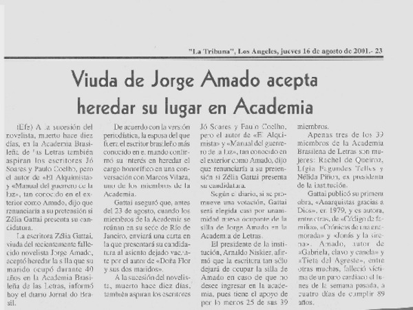 Viuda de Jorge Amado acepta heredar su lugar en Academia [artículo]
