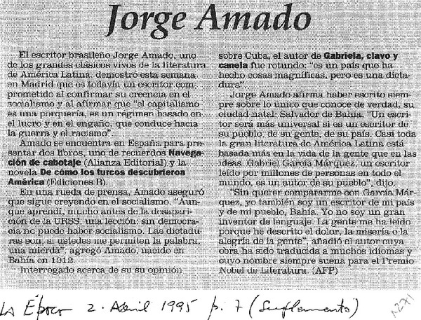 Jorge Amado "No anhelo el Premio Nobel, mi premio mas grande es el público [artículo] André Jouffé.