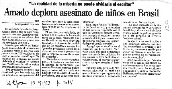 Amado deplora asesinato de niños en Brasil. [artículo]