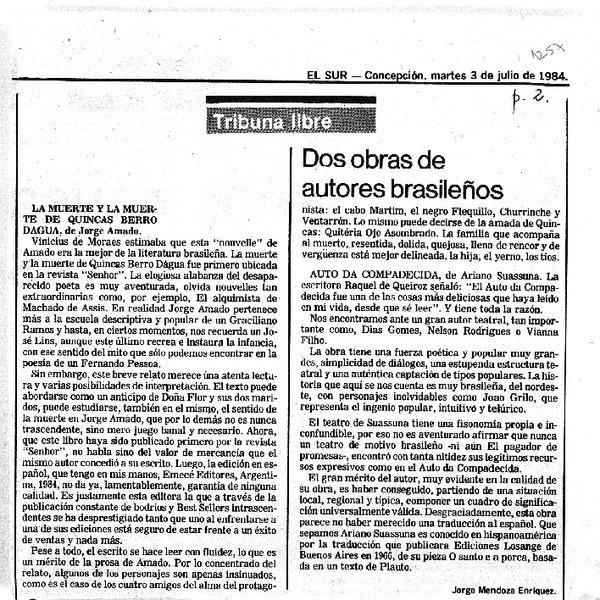 Dos obras de autores brasileños [artículo] Jorge Mendoza Enríquez.