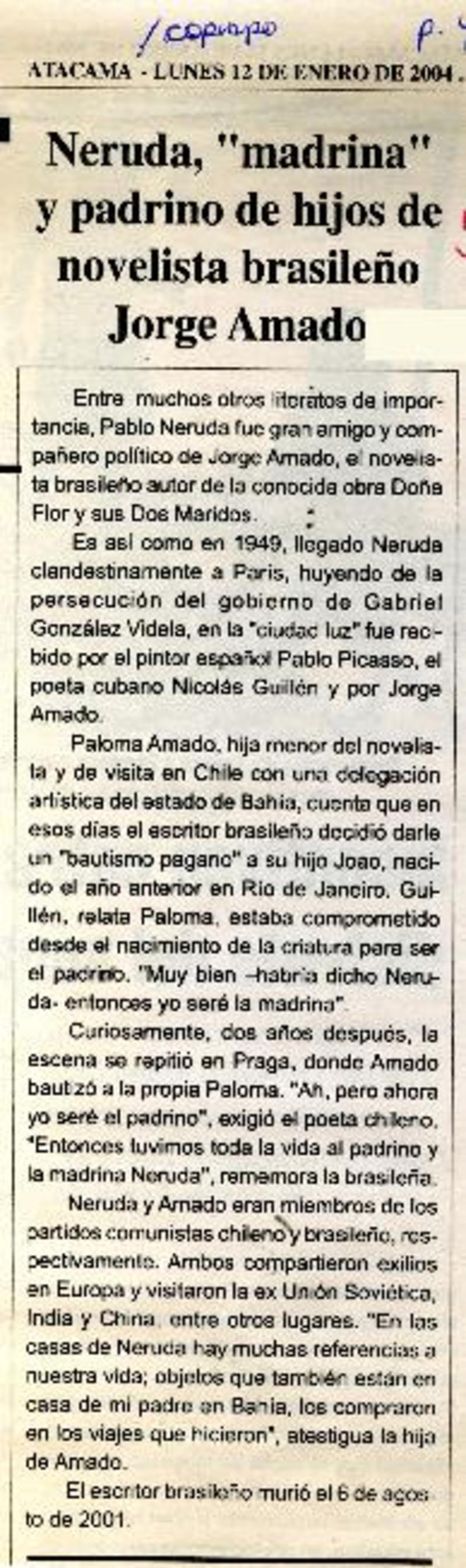 Neruda, "madrina" y padrino de hijos de novelista brasileño Jorge Amado [artículo]