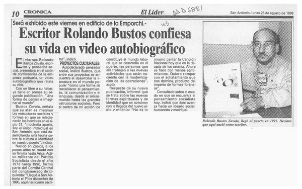 Escritor Rolando Bustos confiesa su vida en video autobiográfico [artículo].