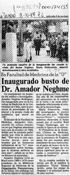 Inaugurado busto de Dr. Amador Neghme [artículo].