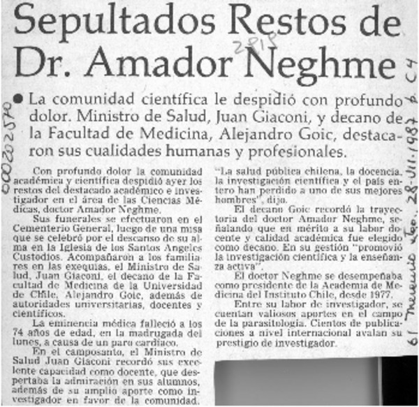 Sepultados restos de Dr. Amador Neghme [artículo].