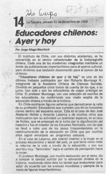 Educadores chilenos, ayer y hoy [artículo] Jorge Aliaga Marchant.