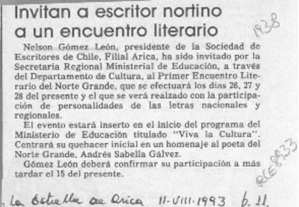 Invitan a escritor nortino a un encuentro literario [artículo].