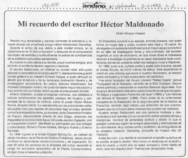 En El Salvador sepultarán al escritor Héctor Maldonado [artículo] Pedro Serazzi.