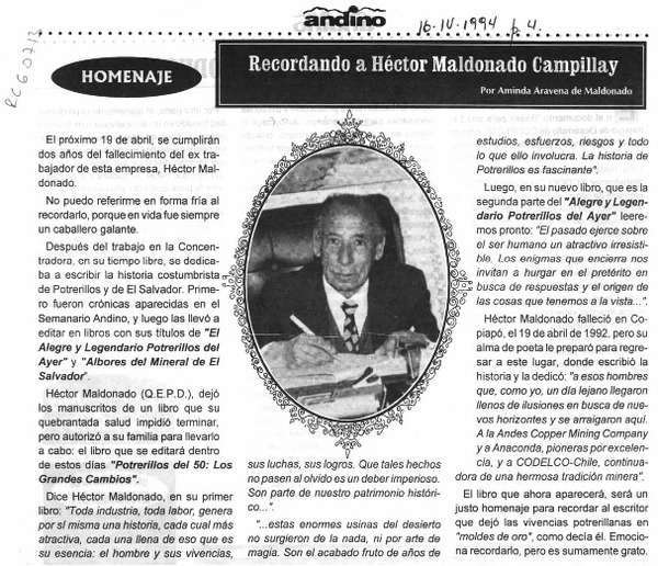 Recordando a Héctor Maldonado Campillay [artículo] Aminda Aravena de Maldonado.