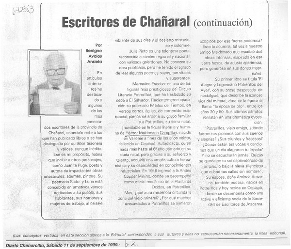 Escritores de Chanaral [artículo] Benigno Avalos Ansieta.