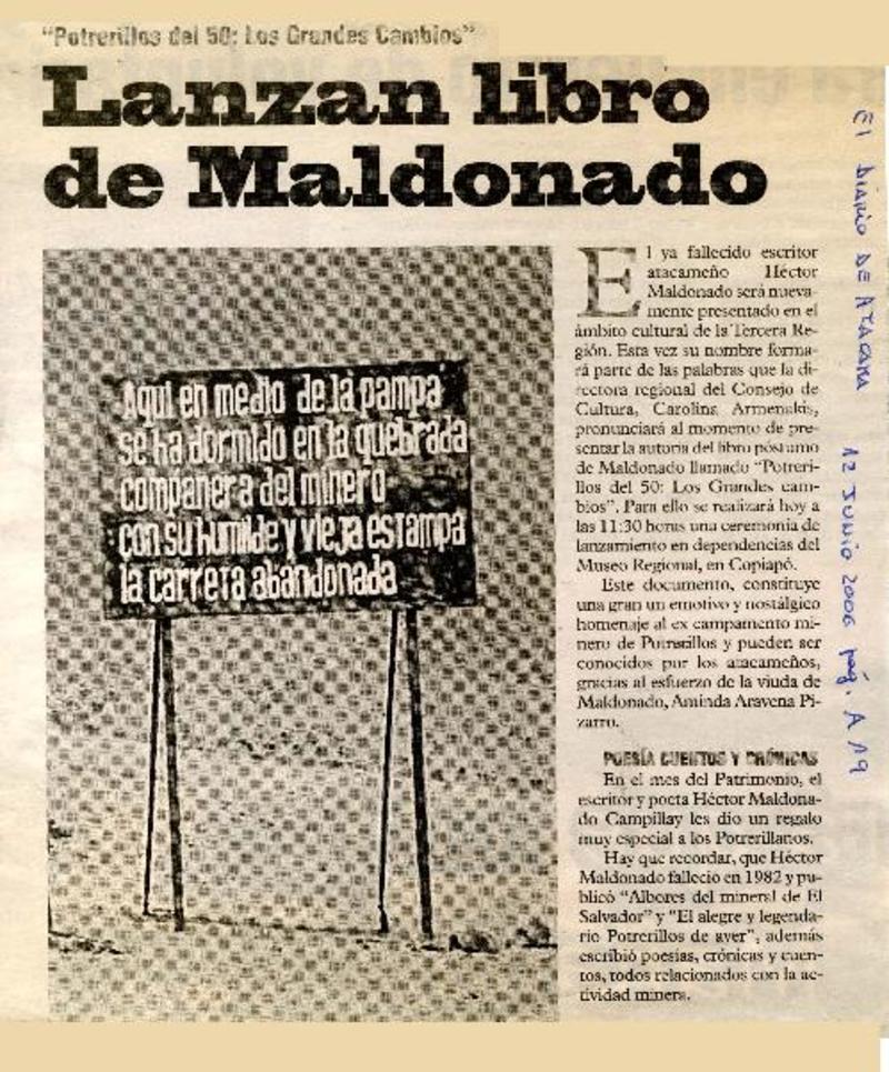 "Potrerillos del 50 : los grandes cambios" Lanzan libro de Maldonado [artículo].