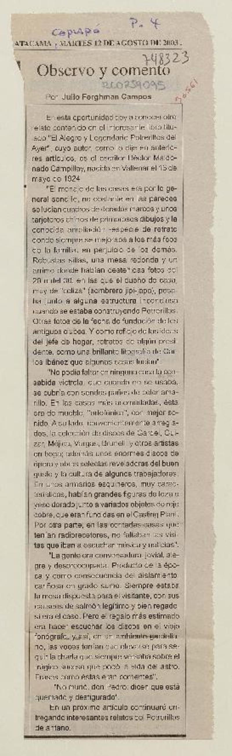 Autores chilenos - Maldonado Campillay, Héctor - Alegre y legendario Potrerillos de ayer, El