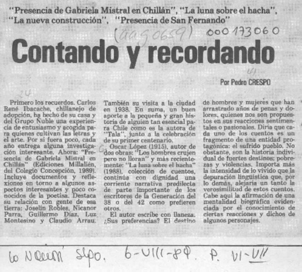 Mistral, Gabriela - Presencia de Gabriela Mistral en Chillán - La nueva construcción - Fernández, Pataglia - La Luna sobre el hacha - López C. Oscar - Aguirre del Real, Lucía - Vargas Badilla, José - Ibacache, Carlos René - Acevedo Cuevas, Josefina - Roca, Reina