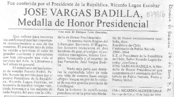 José Vargas Badilla Medalla de Honor Presidencial. [artículo] Enrique León González