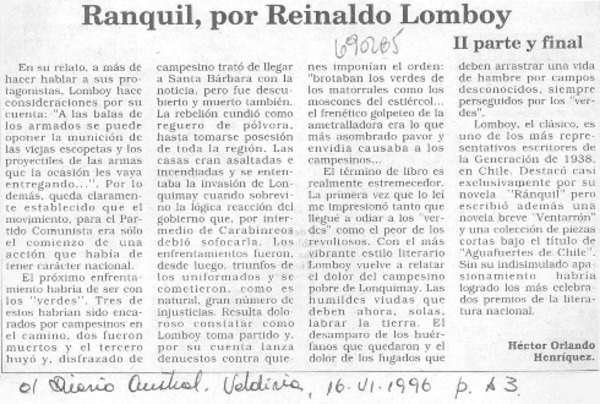 Ranquil, por Reinaldo Lomboy [artículo] Héctor Orlando Henríquez.