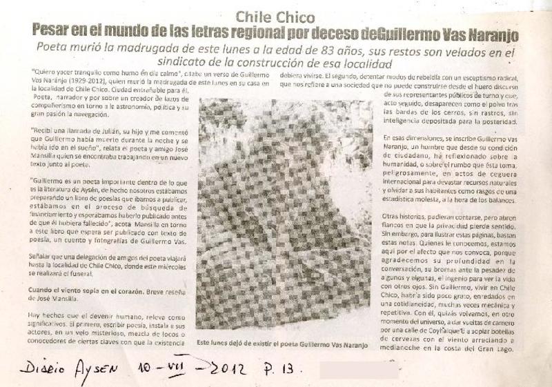 Chile Chico: pesar en el mundo de las letras regional por deceso de Guillermo Vas Naranjo. [artículo]