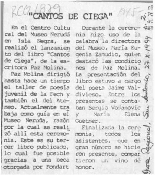 Cantos de ciega [artículo] Fernando Quilodrán.
