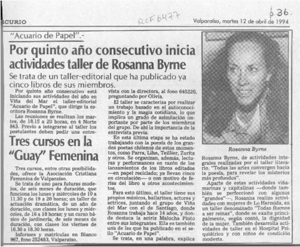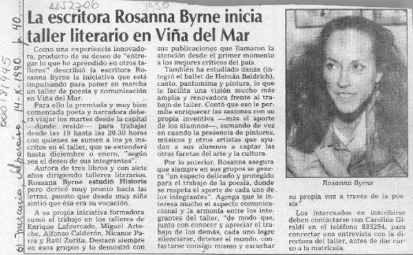 La Escritora Rosanna Byrne inicia taller literario en Viña del Mar [artículo].