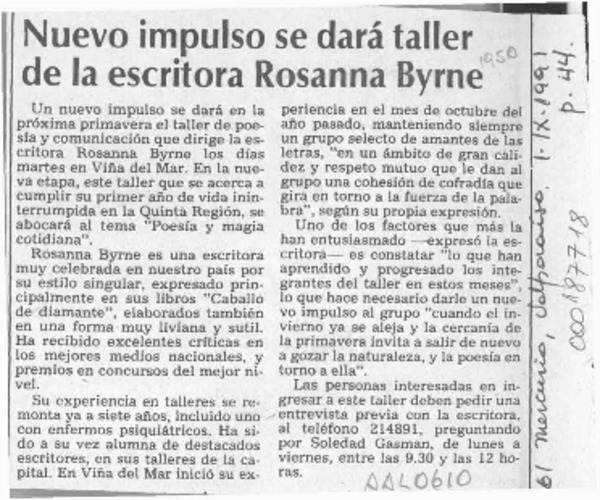 Nuevo impulso se dará taller de la escritora Rosanna Byrne [artículo].