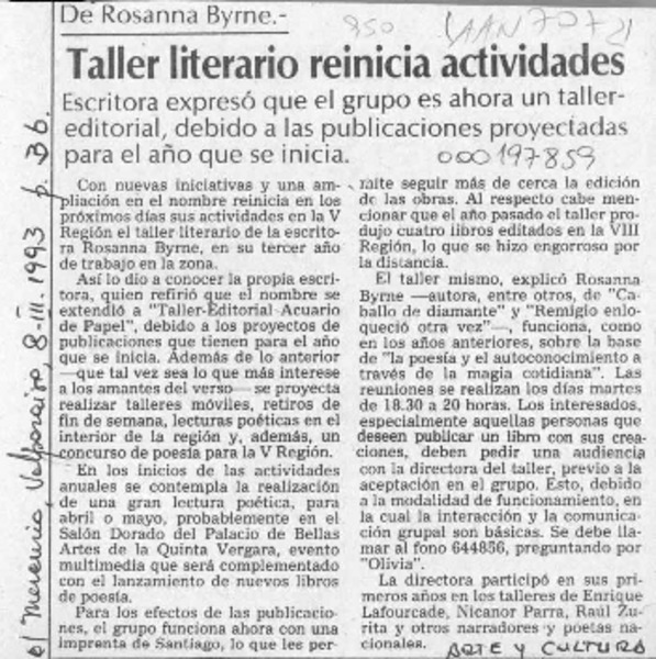 Taller literario de Rosanna Byrne se da un nuevo impulso [artículo].
