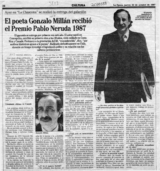 El poeta Gonzalo Millán recibió el premio Pablo Neruda 1987 [artículo] Maura Brescia.