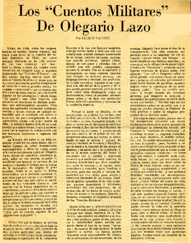 Los "cuentos militares" de Olegario Lazo [artículo] Ignacio Valente.